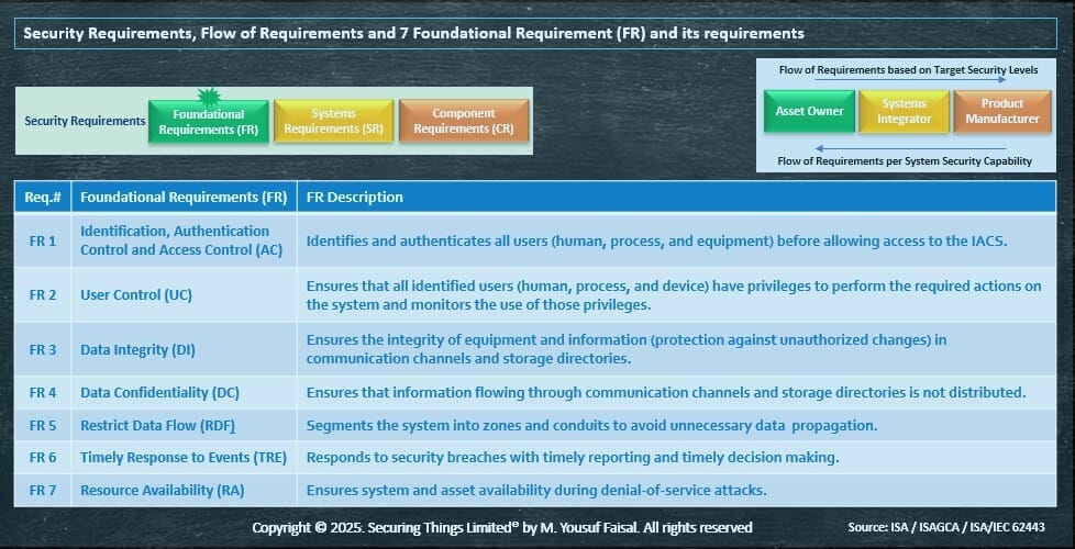 IEC62443-3-3 outlines seven foundational requirements (FRs), which are detailed into a series of system requirements (SRs) and requirement enhancements (REs). The standard provides a chart to map SRs and REs to SLs 1 to 4.